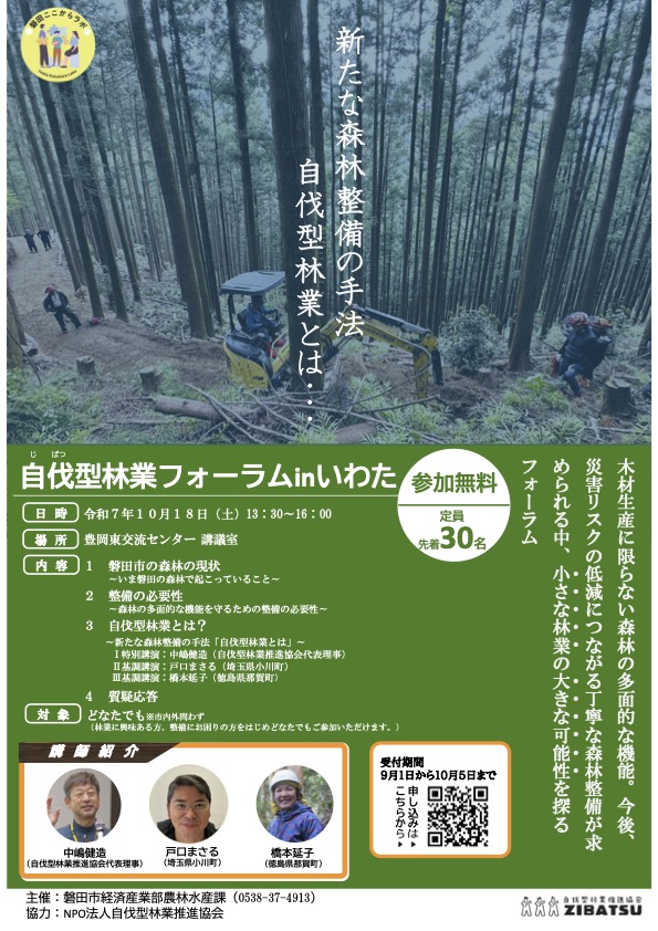 オンラインショップ「自伐すとあ」オープン!新刊「自伐型林業─小さな林業の今とこれから─」発売中!毎週放送のYoutubeチャンネル「ZIBATSUニュース」をチェック!日本列島の面積の7割をしめる森林では、皆伐や荒い間伐作業、放置林が目立っています。 環境保全型で低コスト、参入容易な林業である「自伐型林業」。 これから自伐型林業をはじめたい、自伐型林業に転換したい、 自伐型林業で地域再生を実現させたい、 そんな個人や自治体・地域を支援していきます。自伐型林業とは協会への入会申し込み新着情報 お知らせ一覧を見る イベント 【10/5〆切】10月18日に「自伐型林業フォーラムinいわた」(静岡県)が開催されます 2025.9.25 ニュース 【募集】地域おこし協力隊@岩手県一関市(大東町・下内野集落) 2025.9.3 お知らせ 【募集】地域おこし協力隊@岩手県一関市(千厩町・南小梨集落) 2025.9.2 お知らせ 公式オンラインショップ「自伐すとあ」がオープンしました 2025.9.1 イベント 【募集〆切済】群馬県みなかみ町自伐型林業体験研修 2025.8.26 イベント 【募集】10月4日自伐型林業フォーラム in 安芸高田市 2025.8.12 お知らせ 2025年度夏季:事務所クローズのお知らせ 2025.7.28 イベント 【募集〆切済】秩父地域自伐型林業フォーラムを開催します 2025.7.19 自伐型林業展開自治体・事業体MAP 関連書籍のご紹介 メールマガジン配信中 今すぐ登録する 自伐型林業推進協会FacebookページNPO法人 自伐型林業推進協会