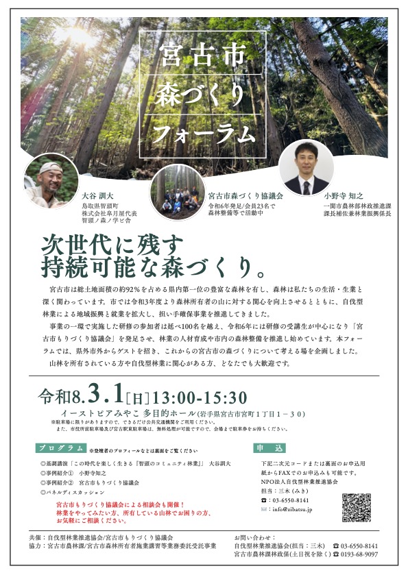 2月7日に東京で開催!移住者と自治体を結ぶマッチングイベントオンラインショップ「自伐すとあ」オープン!新刊「自伐型林業─小さな林業の今とこれから─」発売中!毎週放送のYoutubeチャンネル「ZIBATSUニュース」をチェック!日本列島の面積の7割をしめる森林では、皆伐や荒い間伐作業、放置林が目立っています。 環境保全型で低コスト、参入容易な林業である「自伐型林業」。 これから自伐型林業をはじめたい、自伐型林業に転換したい、 自伐型林業で地域再生を実現させたい、 そんな個人や自治体・地域を支援していきます。自伐型林業とは協会への入会申し込み新着情報 お知らせ一覧を見る イベント 【3月1日開催!】森づくりフォーラム@岩手県宮古市 2026.2.5 イベント 【2/23(月祝)開催】自伐型林業ワークショップ@京都府福知山市 2026.1.28 イベント 【出展者更新】2026/2/15(日)自伐型林業とつなぐ「山の相談会」を開催@秩父 2026.1.26 イベント 【参加自治体追加】2026年2月7日(土)第4回「自伐型林業・移住マッチングフォーラム」@東京 2026.1.26 ニュース 【募集令和8年1月31日まで】地域おこし協力隊@熊本県天草市 2026.1.19 イベント 2026年1月17日(土)林業フォーラム~流域から考える安芸太田町の森2026~@広島 2026.1.11 お知らせ 団体名変更のお知らせ 2026.1.8 お知らせ 2025年度年末年始休業のお知らせ 2025.12.22 自伐型林業展開自治体・事業体MAP 関連書籍のご紹介 メールマガジン配信中 今すぐ登録する 自伐型林業推進協会FacebookページNPO法人 自伐型林業推進協会
