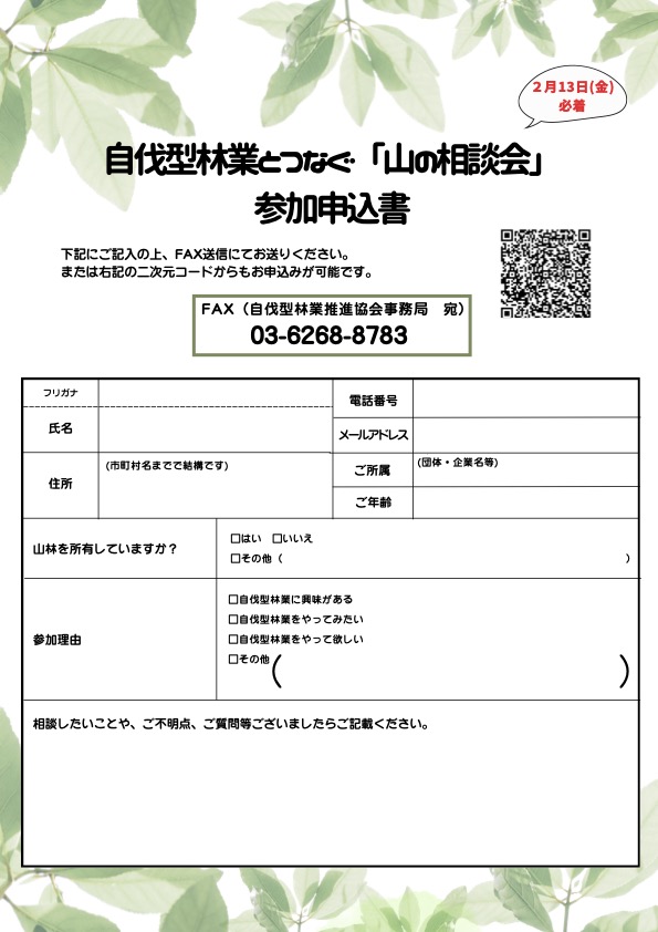 ・FAX番号:03-6268-8783(自伐型林業推進協会事務局)