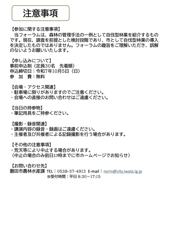 現在、調査を前提とした検討段階であり、市として自伐型林業の導入を決定したものではありません。フォーラムの趣旨をご理解いただき、誤解のないようお願いいたします。そのほかの注意事項は別添チラシをご覧ください。