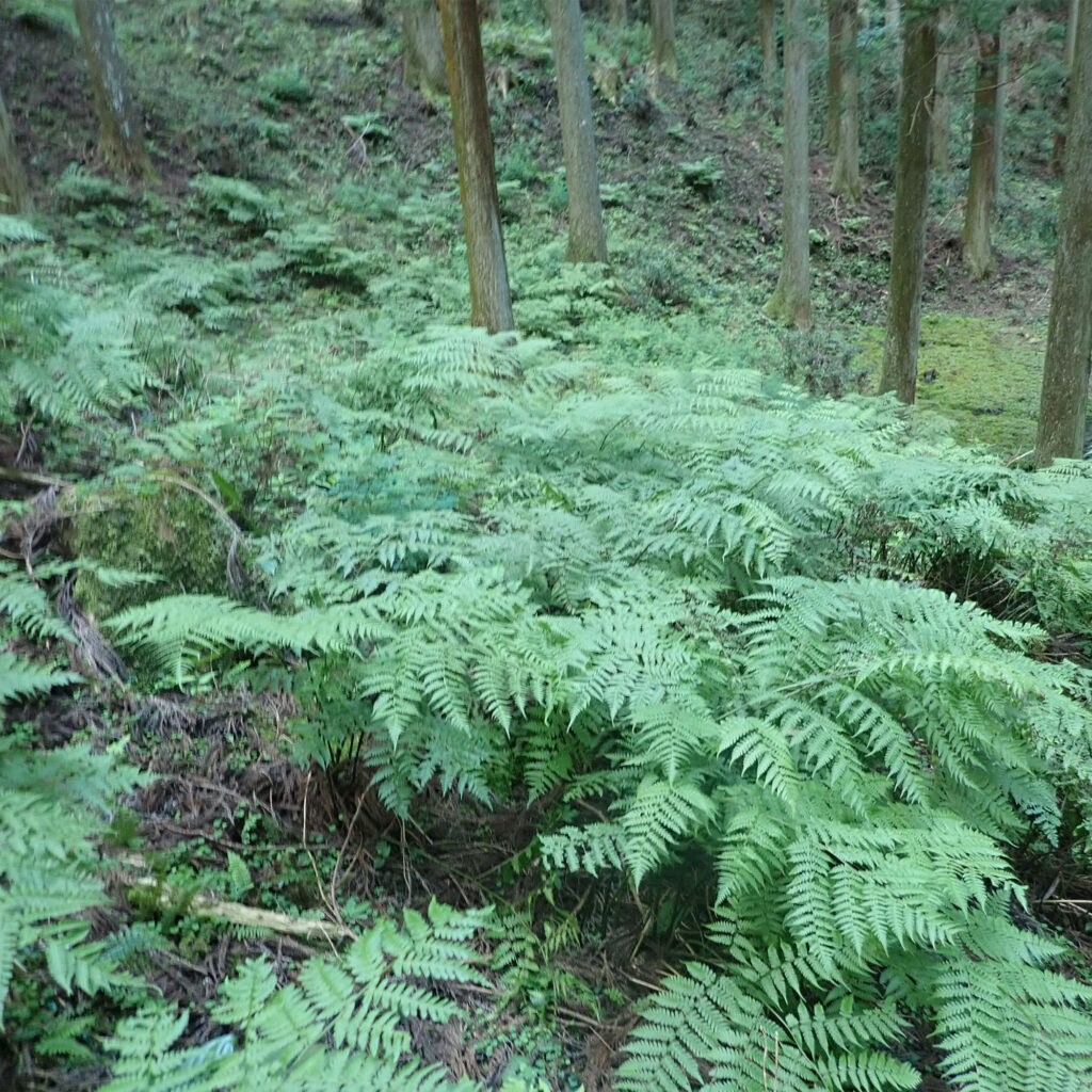 江戸時代から続くスギ・ヒノキ人工林で、長伐期多間伐施業により沢筋から尾根にかけて樹齢200年以上のスギ・ヒノキを育てている。最後の間伐は35年前で、ケヤキ、ホオノキなどの高木類、アブラチャン、コガクウツギなどの落葉低木類、サカキ、ヒサカキ、アオキなどの常緑中低木類があり、混交多層林を形成している。