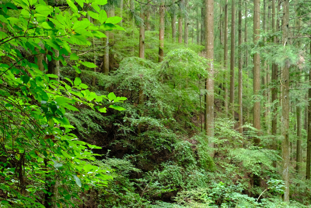 - 複層林で雨をやさしく受け止め、山の保水力を高める